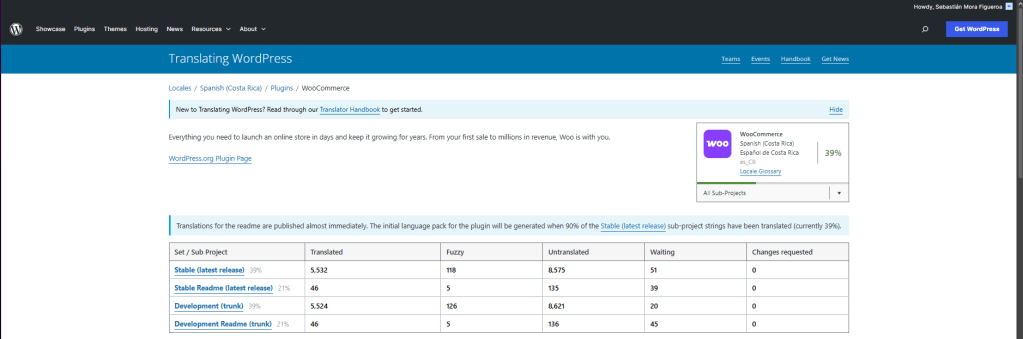 Para esta primera contribución elegí el proyecto WooCommerce, en su versión estable más reciente, dentro del locale Spanish (Costa Rica) – es_CR. Escogí este proyecto porque me parecio interesante esta herramienta y porque ofrece una gran cantidad de cadenas de texto que todavía pueden mejorarse o completarse en español.